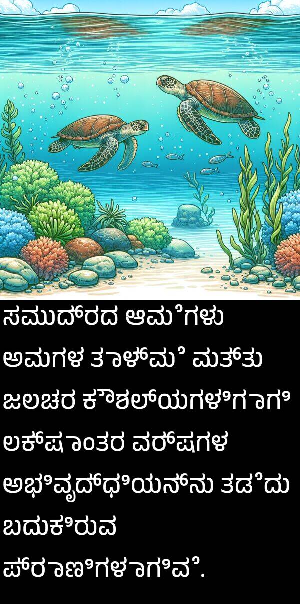 ಸಮುದ್ರದ ಆಮೆಗಳು ಅವುಗಳ ತಾಳ್ಮೆ ಮತ್ತು ಜಲಚರ ಕೌಶಲ್ಯಗಳಿಗಾಗಿ ಲಕ್ಷಾಂತರ ವರ್ಷಗಳ ಅಭಿವೃದ್ಧಿಯನ್ನು ತಡೆದು ಬದುಕಿರುವ ಪ್ರಾಣಿಗಳಾಗಿವೆ.