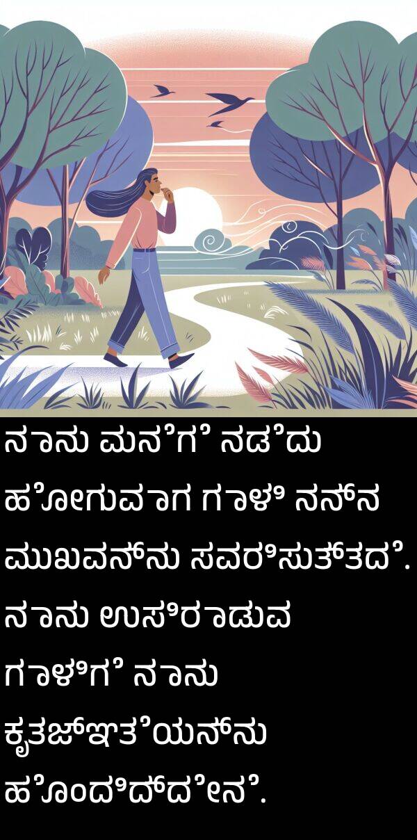 ನಾನು ಮನೆಗೆ ನಡೆದು ಹೋಗುವಾಗ ಗಾಳಿ ನನ್ನ ಮುಖವನ್ನು ಸವರಿಸುತ್ತದೆ. ನಾನು ಉಸಿರಾಡುವ ಗಾಳಿಗೆ ನಾನು ಕೃತಜ್ಞತೆಯನ್ನು ಹೊಂದಿದ್ದೇನೆ.