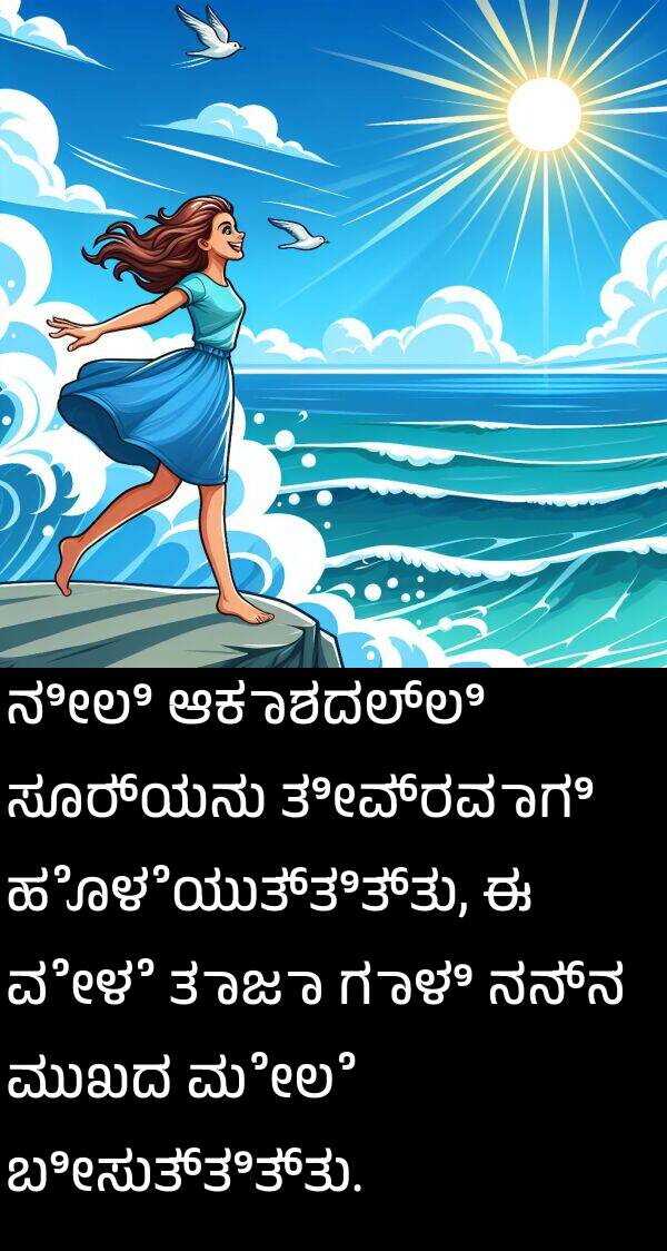 ನೀಲಿ ಆಕಾಶದಲ್ಲಿ ಸೂರ್ಯನು ತೀವ್ರವಾಗಿ ಹೊಳೆಯುತ್ತಿತ್ತು, ಈ ವೇಳೆ ತಾಜಾ ಗಾಳಿ ನನ್ನ ಮುಖದ ಮೇಲೆ ಬೀಸುತ್ತಿತ್ತು.