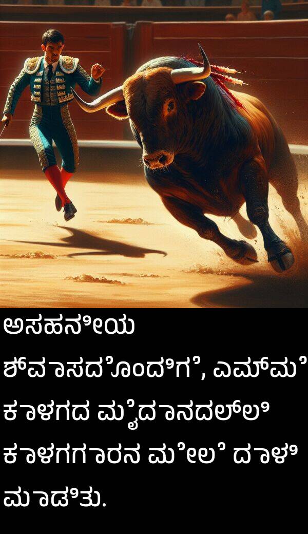 ಅಸಹನೀಯ ಶ್ವಾಸದೊಂದಿಗೆ, ಎಮ್ಮೆ ಕಾಳಗದ ಮೈದಾನದಲ್ಲಿ ಕಾಳಗಗಾರನ ಮೇಲೆ ದಾಳಿ ಮಾಡಿತು.