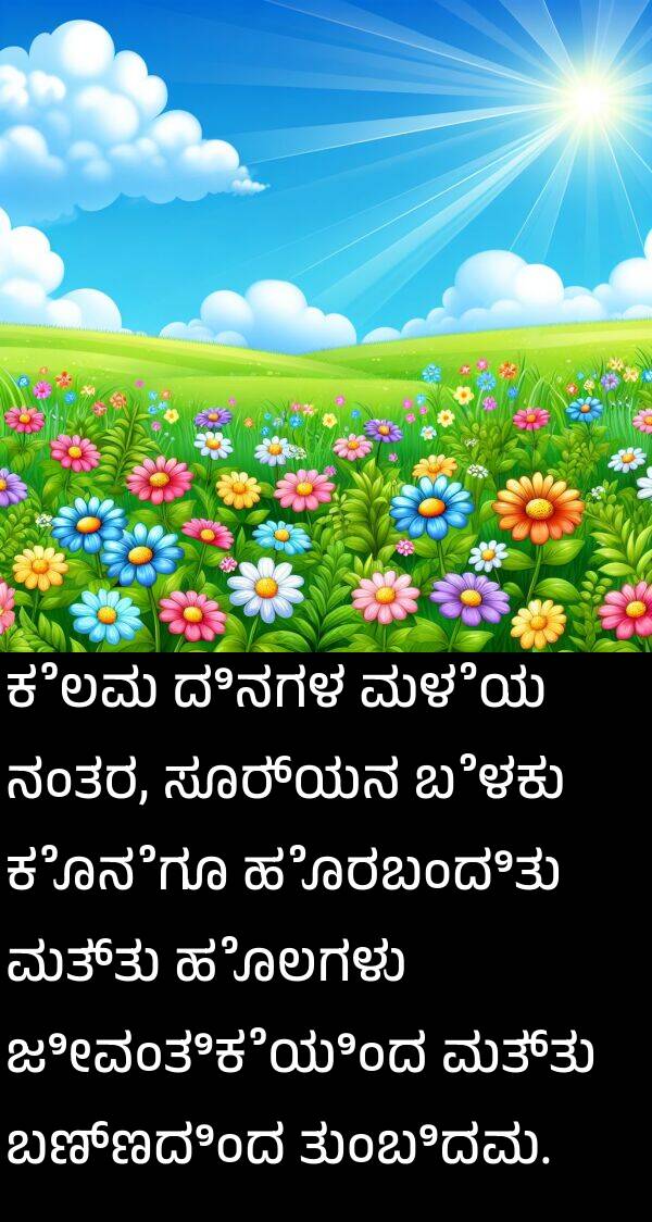 ಕೆಲವು ದಿನಗಳ ಮಳೆಯ ನಂತರ, ಸೂರ್ಯನ ಬೆಳಕು ಕೊನೆಗೂ ಹೊರಬಂದಿತು ಮತ್ತು ಹೊಲಗಳು ಜೀವಂತಿಕೆಯಿಂದ ಮತ್ತು ಬಣ್ಣದಿಂದ ತುಂಬಿದವು.