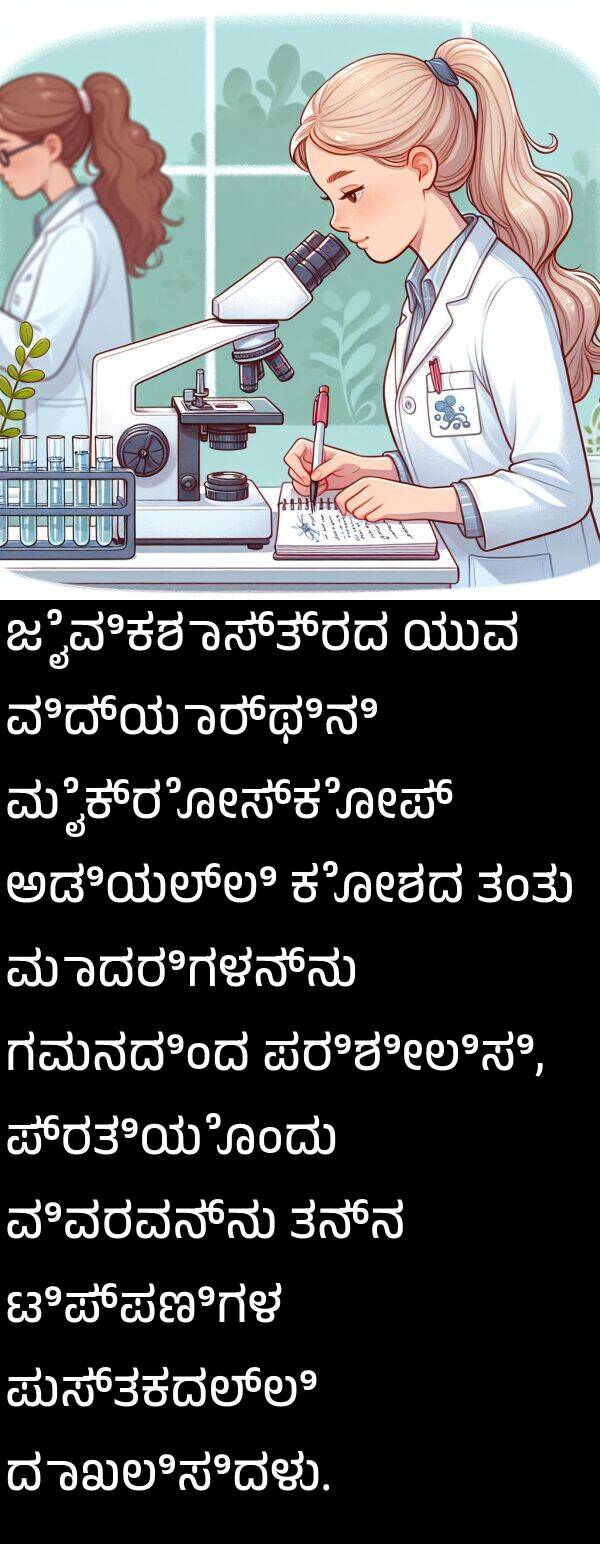 ಜೈವಿಕಶಾಸ್ತ್ರದ ಯುವ ವಿದ್ಯಾರ್ಥಿನಿ ಮೈಕ್ರೋಸ್ಕೋಪ್ ಅಡಿಯಲ್ಲಿ ಕೋಶದ ತಂತು ಮಾದರಿಗಳನ್ನು ಗಮನದಿಂದ ಪರಿಶೀಲಿಸಿ, ಪ್ರತಿಯೊಂದು ವಿವರವನ್ನು ತನ್ನ ಟಿಪ್ಪಣಿಗಳ ಪುಸ್ತಕದಲ್ಲಿ ದಾಖಲಿಸಿದಳು.